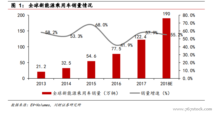 国内电车:产业健康发展,高增速有望保持。2009 年“十城千辆”计划实施以来,我国新能源汽车行业得到了快速发展,产销量不断提升,根据中汽协发布的数据,2017 年我国新能源汽车销量达 77 万辆,同比增长 55%。2015 年以来,我国已连续三年成为全球最大的新能源汽车市场,近三年复合增长率达到117%,截至 2017 年底,全球新能源汽车累计销售 340 万辆,其中我国累计销量超过 170 万辆,在全球的累计销量占比超过 50%。根据工信部的规划,2020年我国新能源车年销量将超过 200 万辆,2025 年新能源车占比超过 20%,未来年均增长依然保持在 40%左右。假设汽车报废周期平均为 5 年,保有量按照五年的销量叠加来计算,我们测算出2020年新能源汽车保有量将达到 570万辆,2025 年超过 1800 万辆。