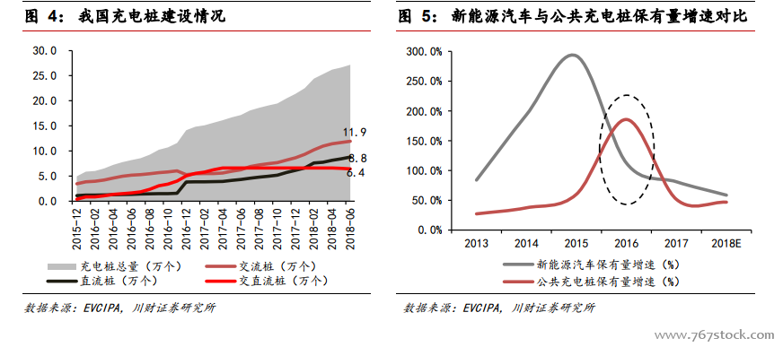 汽车电动化发展方向确定,充电设施需求大幅上升。伴随新能源汽车的发展,行业面临着发展方向的抉择问题,即混合动力车与电动车的抉择。2012 年《节能与新能源汽车产业发展规划(2012-2020)》明确指出,2012-2020 年期间,购买纯电动汽车、插电式混合动力汽车将免征购置税;而中、重度混合动力汽车仅减半征收购置税,且优惠仅持续到 2015 年。同年科技部发布的《电动汽车科技发展“十二五”专项规划》指出,将面向“纯电驱动”实施汽车产业技术转型战略,加快发展“纯电驱动”电动汽车产品。2014 年《国务院办公厅关于加快新能源汽车推广应用的指导意见》再次强调,“以纯电驱动为新能源汽车发展的主要战略取向”,至此,新能源汽车的电动化发展方向得以确定。2018 年 7 月发布的 《汽车产业投资管理规定(征求意见稿)》中甚至提到“插电式混合动力汽车属于燃油汽车投资项目”,电动车乃至纯电动车的发展将是必然趋势,中汽协的数据显示,2018 年 1-6 月,纯电动车销量占比高达 76%,近 8 成的销量占比,充分证明纯电动车当仁不让地成为新能源车市场的主力车型。而电动车的大力发展将对充电设施建设提出更高的要求,根据市场调查,充电桩建设不足已经成为制约新能源汽车推广的首要问题,电动汽车的进一步推广,离不开作为配套基础设施的充电桩的大力发展。