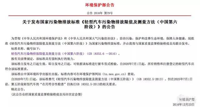 2016年12月23日,环境保护部、国家质检总局联合发布红头文件《轻型汽车污染物排放限值及测量方法(中国第六阶段)》,给出了传说中的“国六”排放要求与实施时间。