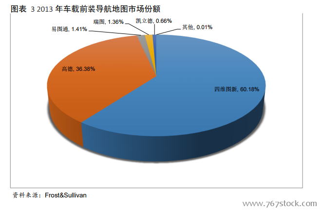 公司垄断优势已形成。根据全球汽车领域权威调研机构 Frost & Sullivan 发布的 2013 年中国车载前装导航地图市场数据,四维图新以 60.18%的市场份额领跑,远超于位居第二的高德 36.38%的市场份额。这也是自 2003 年以来,四维图新连续 11 年在中国车载导航市场份额遥遥领先。