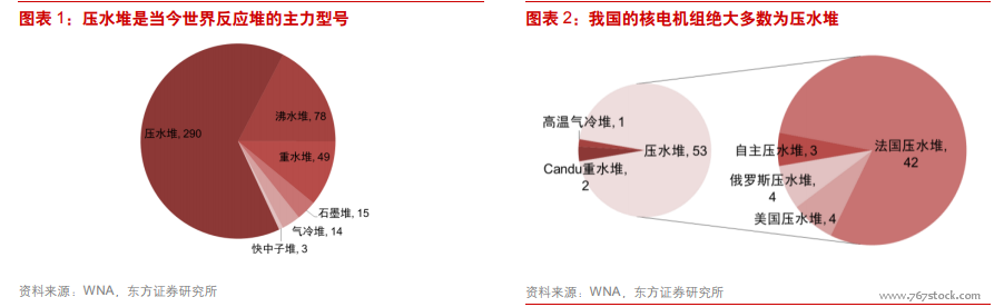 压水堆是我国核电事业起步阶段的必然选择。核反应堆是利用链式裂变反应缓慢地、受控制地释放核能的装置。适应用于发电的反应堆技术包括轻水堆、沸水堆、重水堆等,其差别在于中子冷却剂和慢化剂不同。压水堆是当今世界商用核反应堆的主力堆型,占全球反应堆总量的 65%,另一种以轻水为慢化剂和冷却剂的堆型为沸水堆,占反应堆总量的 17%,除压水堆和沸水堆外,小批量商运的反应堆堆型还有重水堆、石墨堆以及仍在探索中的四代堆型。我国目前已建成和在建的 56 座反应堆中,除秦山三期和石岛湾高温气冷堆外,都为轻水压水堆,合计占比达 95%。