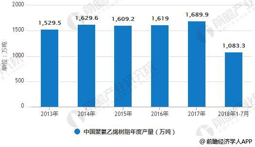 2015年-2017年中国聚氯乙烯树脂产量呈小幅度增长趋势,2017年中国聚氯乙烯树脂产量为1689.9万吨,同比增长5.9%。2018年1-7月中国聚氯乙烯树脂产量为1083.3万吨,同比增长4.3%。