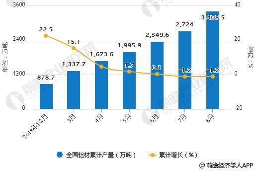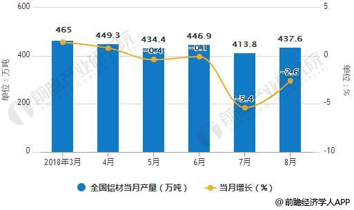 据前瞻产业研究院发布的《铝加工行业市场前瞻与投资战略规划分析报告》统计数据显示,2018年3-7月全国铝材产量呈下降趋势,2018年7月全国铝材产量为413.8万吨,同比下降5.4%。2018年8月全国铝材产量有所回升,2018年8月全国铝材产量为437.6万吨,同比下降2.6%。2018年1-8月全国铝材产量为3408.5万吨,同比下降1.2%。