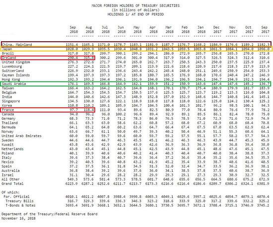 以下TIC截图展示了2017年9月至2018年9月主要国家地区每月持有美债规模,单位为10亿美元。