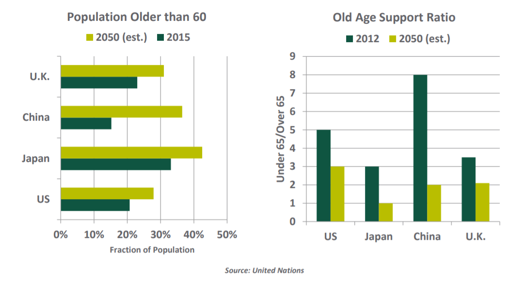 他们指出,在接下来的十年中,许多全球重要经济体的人口将面临老龄化的问题。劳动力人口增速放缓限制了经济增长的能力。由于退休潮的到来,养老基金的资金问题将暴露在公众视野中。