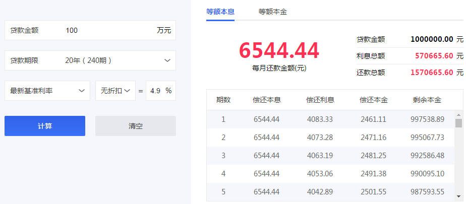 贷款100万,每月还款6544元