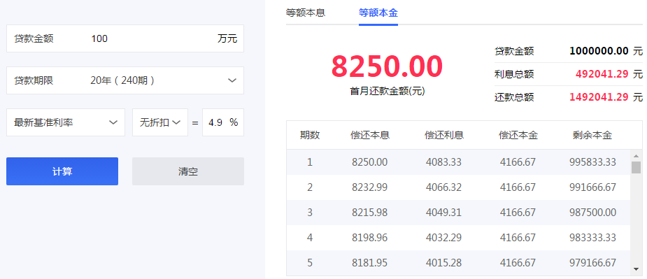 贷款100万,首月还款8250元,后面逐月递减。