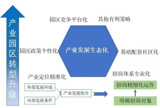 现有园区因其发展情况不同,产业提升的方向也有所差异。产业园区需结合自身条件对产业进行“整理、优化、升级”,确立园区的主导产业,围绕主导产业找到转型升级的路径。以产业定位精准化、产业发展生态化、招商体系专业化、园区政策个性化、基础配套社区化、园区竞争平台化等策略整合园区资源、提升园区竞争力、引导园区转型升级。