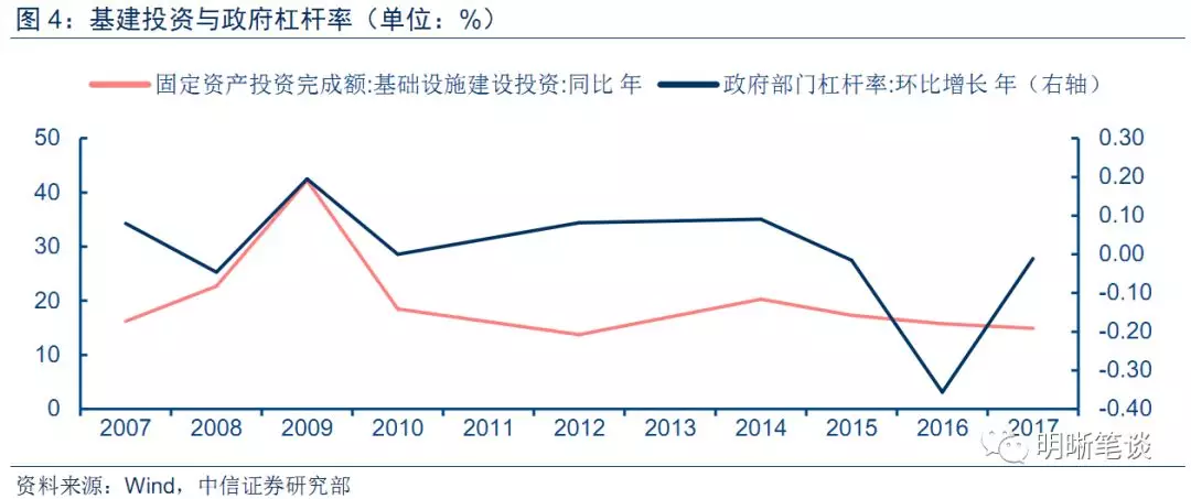 财政赤字是逆周期调节的重要工具。由于我国基建投资的资金来源主要是来源于政府资金,政府赤字率的上升往往也将带来基建投资的上行。从历史回溯中可以看到基建投资与中央政府杠杆率大致正相关,如2009年期间政府杠杆率与基建投资均出现大幅上行。而政府投资中,基建投资的比例也是近几年来也是逐年上涨,因此,政府赤字率水平的下调将影响到基建投资增速的放缓。