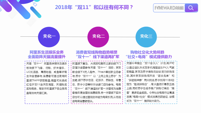 报告聚焦天猫“双11”,认为在第十个“双11”,天猫已经出现了新的调整和变化,主要体现在阿里系生活娱乐业务,全面助阵天猫流量提升;消费者双线购物趋势明显,“双11”线下渠道再扩军;购物社交化大势所趋,“社交+电商”模式提供助力等。