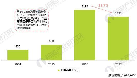 从2014年网络大电影概念问世至今,网络大电影的市场规模一直处于高速增长的模式。据前瞻产业研究院发布的《电影产业市场前瞻与投资战略规划分析报告》统计数据显示,2014年,网络大电影的规模约为1亿元,而经过4年的磨合和发展,2017年网络大电影的市场规模已经高达约20亿。与市场规模共同高速增长的还有网络大电影的数量。2014年共上映网络大电影450部,至2017年全年各平台上映数量合计以达到1892部。