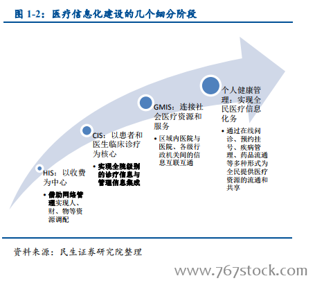 医疗机构建设仍是主要内容,互联网医疗机遇初现。根据中国医院协会信息管理专业委员会披露的数据,国内 HIS 细分项目平均渗透率为(均为算术平均,下同)32.82%;CIS 细分项目平均渗透率为 26.02%,同时国内仅有 37.4%的医院参与区域医疗信息化的建设。由此可见行业仍存较大空间,医疗机构的信息化建设处于由第一阶段向第二、第三阶段不断完善的过程。
