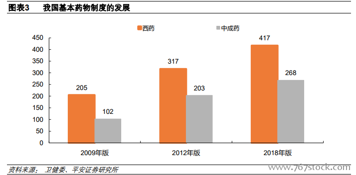 基本药物目录不断扩容。2018 年 10 月 25 日国家卫健委公布《国家基本药物目录(2018 年版)》,于 11 月 1 日起在全国正式实行。新版基药目录共包括 685 个品种,其中西药 417 种、中成药(含民族药)268 种。相比 2012年版的 520 种本次医保目录增加了 165 种,其中调入药品 187 种,调出 22 种。