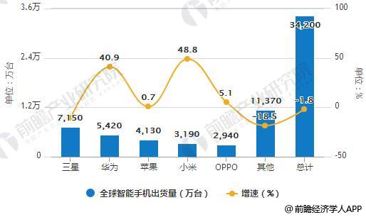 据前瞻产业研究院发布的《手机行业市场前瞻与投资预测分析报告》统计数据显示,2018年第二季度全球智能手机出货量三星排名第一,出货量为7150万台,市场份额超20%;排名第二的是’华为,2018年第二季度出货量为5420万台,市场份额为15.8%,出货量同比增长40.9%,排在第三的是苹果,出货量为4130万台,市场份额为12.1%,出货量同比增长0.7%;其后分别为小米和OPPO,出货量分别为3190万台、2940万台,市场份额分别为9.3%,8.6%。值得注意的是,华为首次超越苹果成全球第二大智能手机厂商。
