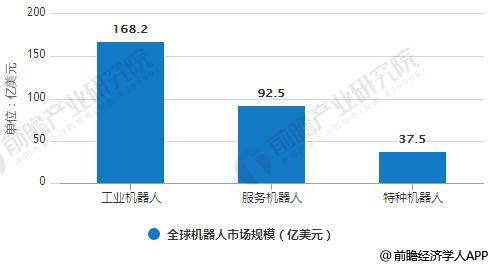 据前瞻产业研究院发布的《工业机器人行业产销需求预测与转型升级分析报告》统计数据显示,预计2018 年,全球机器人市场规模将达到298.2亿美元,2013-2018 年的平均增长率约为 15.1%。其中,工业机器人市场规模为168.2亿美元,服务机器人市场规模达92.5亿美元,特种机器人市场规模达到37.5亿美元。