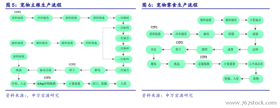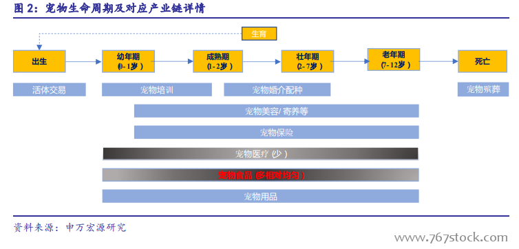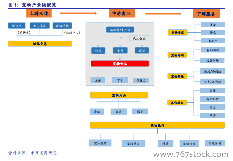 宠物食品处于宠物产业链的中游。宠物食品是中游商品的一种,从产品多样性来看,宠物食品包括宠物主粮、宠物零食和宠物保健品等;从参与主体来看,宠物食品的参与者包括生产商、品牌商、代工企业,也包括多种不同的渠道(如宠物医院、宠物店等特种渠道,电商平台和商超渠道等)。