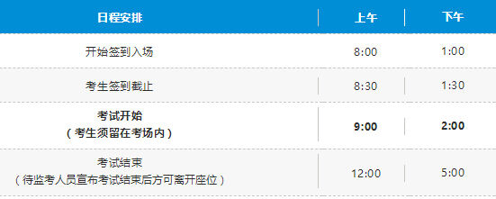 考试当日的正式起止时间以官方指定监考人员公布为准。如果考生未参加上午的考试,则不能参加下午的考试,上下午两场考试均参加才能有考试成绩。