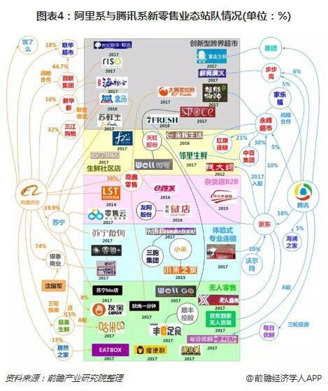 各零售业态零售纷纷站队位居《2018中国新零售百强》榜单第一二名的综合电商两巨头阿里与京东所在阵营,市场形成了以阿里系与腾讯系为首的两超多强格局,依托资本、流量与技术支持,布局新零售生态。