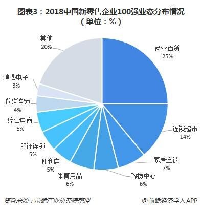中国新零售企业100强中商业百货、连锁超市两大业态合计占比高达39%,综合电商数量仅占市场的5%,是由于中国商业百货、连锁超市等传统零售企业众多,综合电商市场主要由阿里巴巴、京东等巨头垄断的市场格局现状决定的。