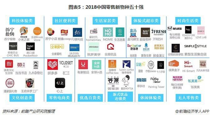 据2018年5月品途集团智库发布的《2018中国零售新物种五十强》榜单,从运营数据、资本引力、数字影响与模式创新四大维度对中国零售初创企业进行评估,评选出2018中国零售新物种五十强。各种模式创新零售新物种涌现,可分为十一类,分别为科技体验类、社区便利类、生活家居类、体验式超市类、时尚生活类、文化创意类、零售电商类、优选百货类、新式饮品连锁类、休闲体验类、无人零售类。