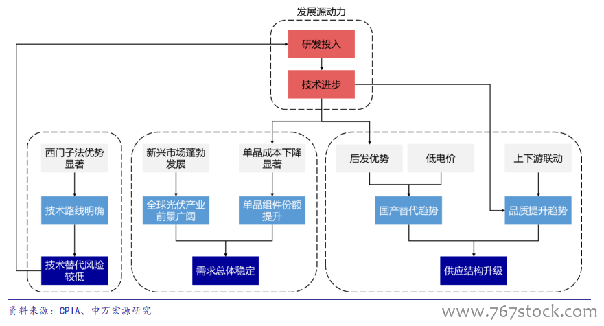 多晶硅位于光伏产业链上游,资金和技术壁垒较高。多晶硅位于光伏产业链最上游,与硅片、电池片、组件环节不同,多晶硅环节更多的具有化工行业的属性。多晶硅生产初始设备投资要求较高,2017 年我国多晶硅投资成本平均水平约为 1.7 亿元/千吨;扩产周期较长,一般而言,多晶硅从投资建设到调试完毕并量产需要一年多的时间(2017 年水平);技术壁垒明显,主要表现在生产工艺复杂,安全性和环保要求较高。