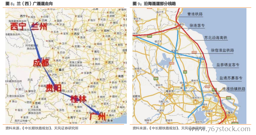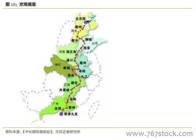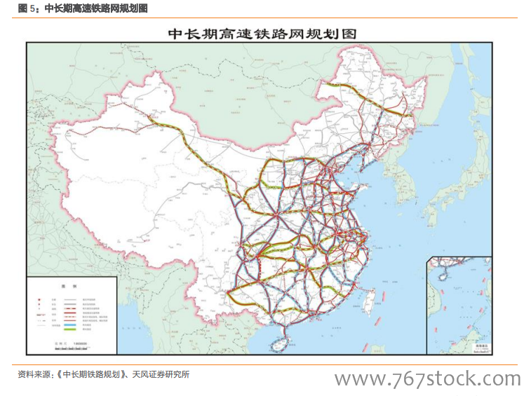 考虑地理区位和经济效益,部分高铁可能适度提前建设。我们认为,中长期铁路规划的部分重要线路可能适度提前建设,特别是兰(西)广通道、沿海通道和京港通道,以及以西安为核心的“米”字形高铁网等,因其地理区位和经济效益处于铁路网的优先级。