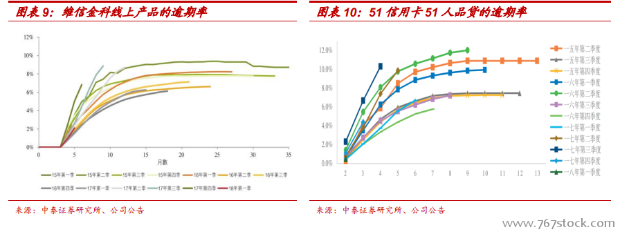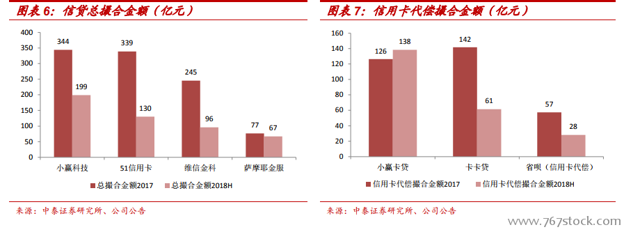 交易规模及客户基数。从平台总交易量来看,四家公司从大到小依次为小赢科技、51 信用卡、维信金科和萨摩耶金服。在信用卡代偿领域,2017年卡卡贷的交易量排名第一;小赢卡贷增长迅猛,2018H 的交易量保持高增长,而卡卡贷今年以来的放贷速度有所放缓。从平台注册客户来看,51 信用卡和维信金科排名靠前,均超过 5000 万;累计借款客户方面,小赢科技、51 信用卡和维信金科都超过了 200 万。萨摩耶金服的交易量和借款客户数量相对较小。