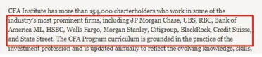除了上述信息外,CFA还在报告中指出,CFA持证人正广泛受雇于摩根大通、瑞银、RBC、美国银行ML、汇丰银行、富国银行、摩根士丹利、花旗集团、贝莱德、瑞士信贷和华尔街顶级金融公司等雇主: