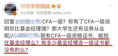 近日,高顿君在微博上看到一个英国留学回来,通过CFA一级的网友,在回复一位金融分析师微博时,口出狂言:自己持有CFA一级资格证书(一级哪来的证书?),比很多基金经理强...