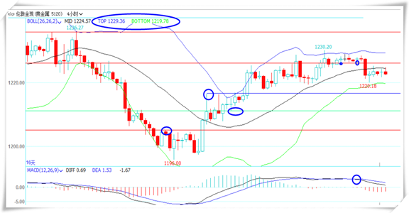 4小时图显示,震荡;留意布林线轨道1218-1230域突破情况;MACD和KDJ死叉运行,金价目前也受到布林线中轨的压制,短线偏向震荡下破;然后1218和1212附近也分别存在一些支撑。上方初步阻力则在1226附近,若意外回升至该位置上方,则削弱短线看空信号;若意外进一步上破布林线上轨1230阻力,则增加短线看涨信号;进一步阻力仍在1236附近。