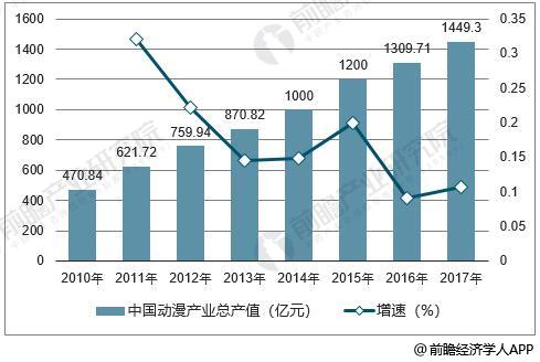 据前瞻产业研究院发布的《动漫产业发展前景预测投资战略规划分析报告》统计数据显示,2010年我国动漫产业总产值仅仅为470.84亿元,到了2014年我国动漫产业总产值达到了1000亿元,截止到2017年底,我国动漫产业总产值已经达到1449.3亿元,较2016年增长10.66%,2010-2017年间复合增长率达到17.42%。