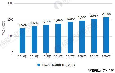 据前瞻产业研究院发布的《模具行业发展前景预测与投资战略规划分析报告》统计数据显示,我国模具制造厂点约30000 家,从业人员约100万人。2015 年全国模具总销售额约1718亿元,企业自用模具产值约400亿元。到了2016年全国模具总销售额达到了1800亿元。2013 年至2015年,我国模具总销售额的年均复合增长率达到 6.1%。预计2018年全国模具总销售额及将接近2000亿元,预计到了2020年全国模具总销售额将达2188亿元。