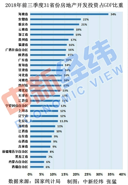 记者梳理发现,2017年前三季度31省份“房地产开发投资占GDP比重”前三名与今年相同,也是海南、安徽、重庆。易居研究院智库中心研究总监严跃进认为,海南、安徽、重庆占比高与此三省的招商力度大有关系,也和具体的产业导入有关。