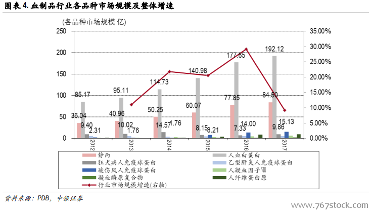 除肌丙外我国血制品行业市场规模 325 亿,5 年 CAGR 为 18.14%。由于肌丙临床用量较小,此处我们只统计测算临床常用的 8 种血制品品种。根据测算,2017 年血制品行业整体规模为 324.87 亿元,5 年 CAGR 为 18.14%,如剔除涨价因素,仅考虑量的增长 5 年 CAGR为 12.25%。各品种的销量来讲,近 5 年增速最快的是人凝血因子Ⅷ CAGR 为 29.18%,其次为凝血酶原复合物和人纤维蛋白原 CAGR 分别为 25.71%和 21.98%,白蛋白和静丙的 5 年 CAGR 为 13.88%和13.77%,破免和狂免的 5 年 CAGR 为 8.78%和 6.26%。目前规模前几的品种为人血白蛋白 192.12 亿、静丙 84.5 亿、破免 15.13 亿、狂免 9.86 亿、人纤维蛋白原 9.69 亿。