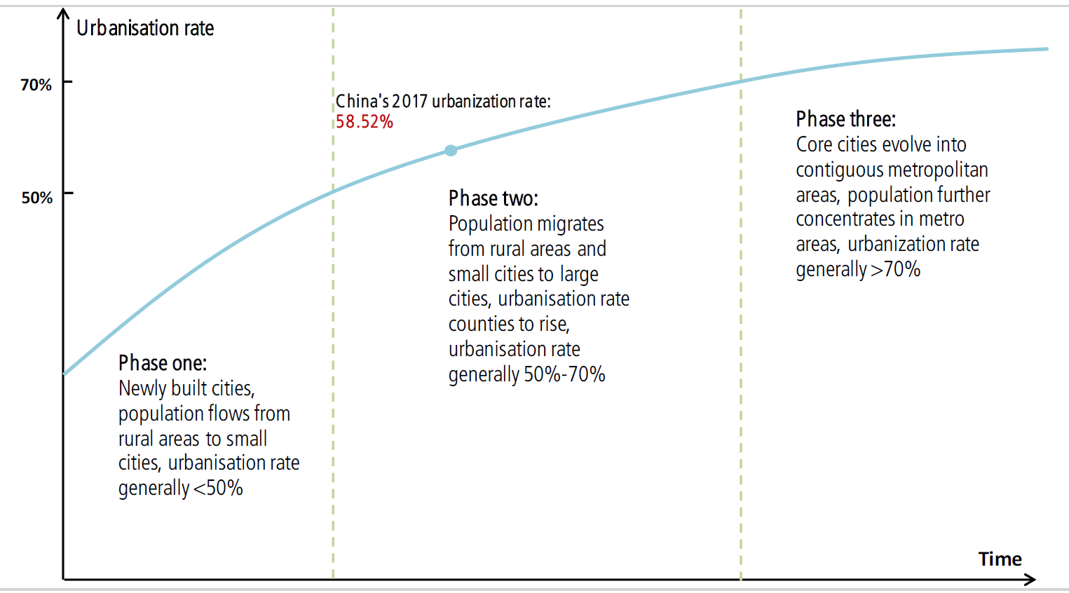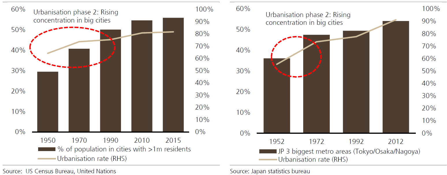 (城市化的不同发展阶段与人口聚集效应,来源:瑞银)