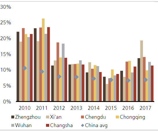 (新兴城市群核心城市GDP增速与平均增速对比,来源:瑞银)