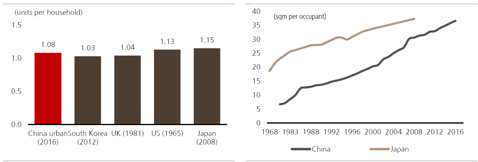 (中国城镇居民户均住房保有量和人均居住面积已经达到日本2008年水平,来源:瑞银)