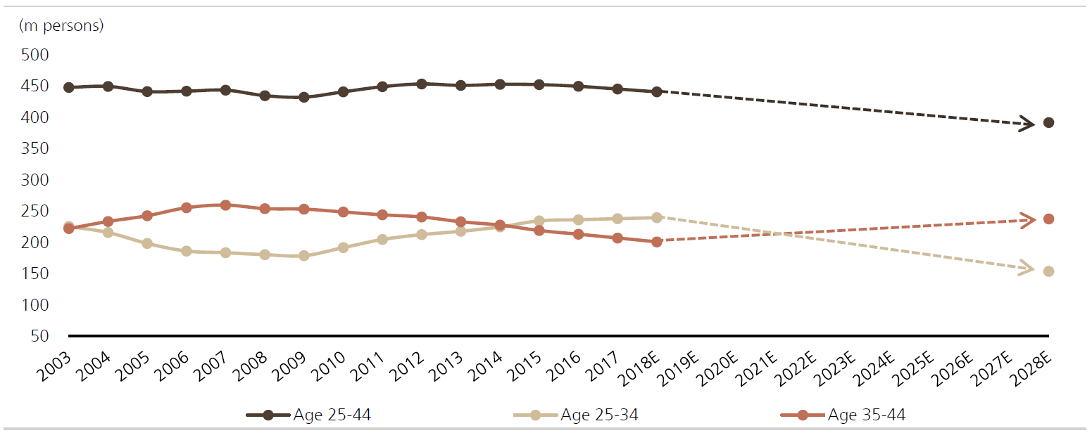 瑞银预计,虽然25-44岁的适龄购房人口将会从4.4亿下降到3.9亿,但35-44岁的改善性目标人群将会从2亿上升到2.4亿,这也意味着25-34岁的首次置业目标人群将会从2.4亿大幅下滑至1.5亿。
