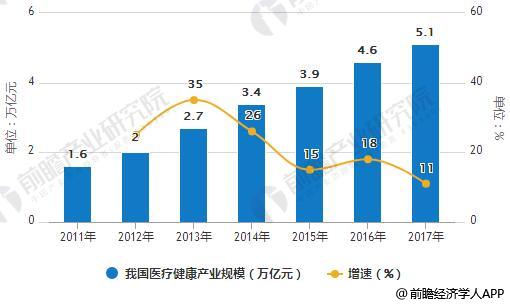 据前瞻在国家政策的大力支持下,我国医疗健康产业未来市场前景广阔。据前瞻产业研究院发布的《医疗健康行业并购重组趋势与投资战略规划分析报告》统计数据显示,医疗健康产业规模从2011年的1.6万亿元增长至2015年的3.9万亿元,产业规模扩大了1倍以上。2016年我国医疗健康产业的市场规模已经达到4.6万亿元,同比增长约18%,2017年,我国医疗健康产业的市场规模已经达到5.1万亿元。预计到2020年,我国医疗健康产业总规模将超过8万亿元。
