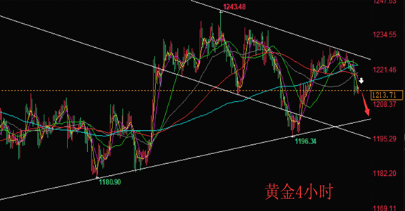 技术分析,日线连阴回落,跌破生命线和均线支撑形成压力1218-1220区域,此位置也是六个交易日的支撑位置,同时是拱桥圆弧顶颈线位置,此位置的压制将促使行情围绕布林带中轨与下轨运行1220-1210-1200区域。4小时图承压均线压制有效,失守均线和年线的支撑形成压制,两者靠拢交叉位置1218-1220,通道线与趋势线支撑叠合在1205-1200区域范围。MACD向下开口,运用高概法则之一的准则,反弹均线压制便是跟空。