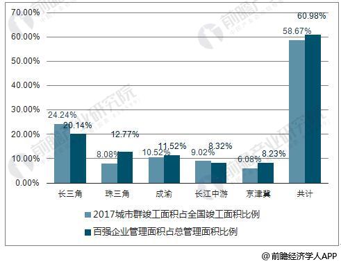 2017年,百强企业60.98%的管理面积位于五大城市群,其中, 在长三角、珠三角、成渝、长江中游及京津冀五个主要城市群分布比例分别为 20.14%、12.77%、11.52%、8.32%及8.23%。我国以城市群为核心的空间发展格局已基本形成,其衍生的巨大住房与物业管理需求,为物业管理行业创造了更广阔的发展空间。