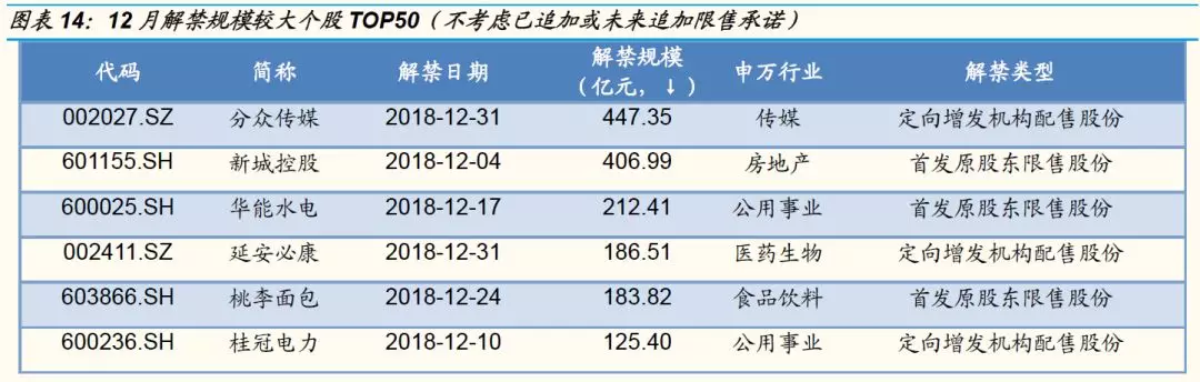 12月解禁集中在个别个股,解禁规模较大的个股依次为:分众传媒、新城控股、华能水电、延安必康、桃李面包等。从12月解禁个股方面来看,按照2018年11月27日收盘价测算,解禁规模较大的依次为分众传媒(447.35亿元)、新城控股(406.99亿元)、华能水电(212.41亿元)、延安必康(186.51亿元)、桃李面包(183.82亿元)等。