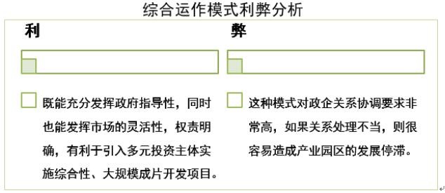 综合运作模式是指产业园区开发模式、主体企业引导模式和产业地产商模式混合运用的开发模式。这种模式下,政府提供土地、税收等优惠政策,并成立管委会负责行政管理事务,地产商投资开发建设并提供相应的园区服务,龙头企业入驻发挥产业号召力,多方合力共同推进产业园区开发和经营。