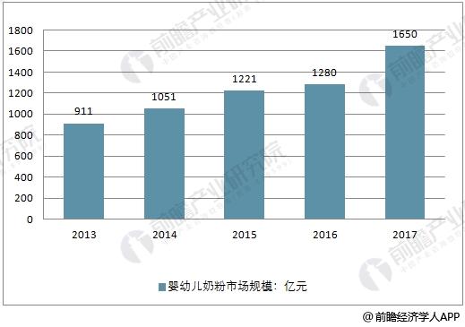 据前瞻产业研究院发布的《中国奶粉行业市场前瞻与投资战略规划分析报告》数据显示,婴幼儿奶粉市场规模从2013年的911亿元增至2017年的1650亿元,年均复合增长率达到16%。不过2016年中国婴幼儿奶粉市场规模增速略有下降,据了解,这主要是由于出生率下降及中国消费者跨境购买量增加所致。据预测2018年中国婴幼儿奶粉行业市场规模将有望突破2000亿元。
