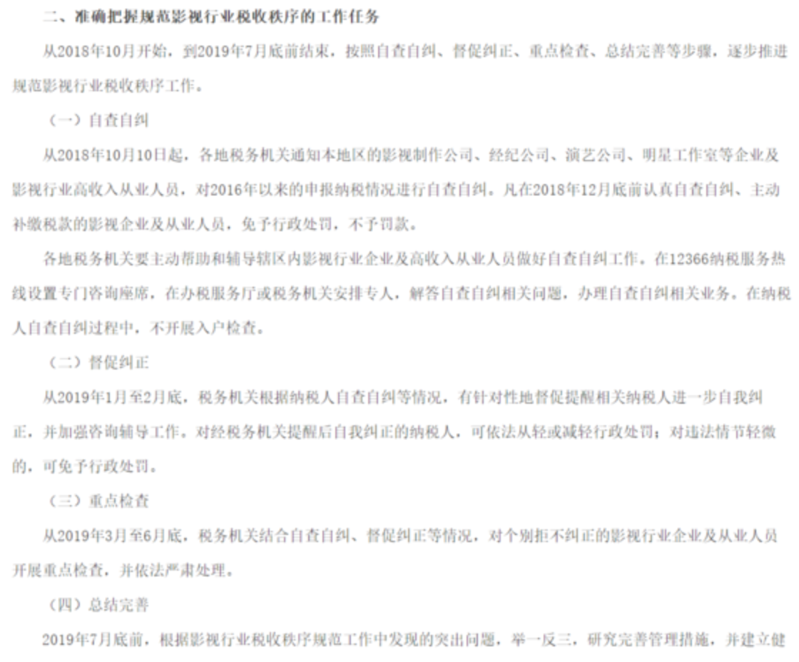最终,税收改革政策从表演行业,延伸到了影视领域的各个行业。10月初,国家税务总局下发通知,从今年10月10日起,各地税务机关通知本地区影视制作公司、经纪公司、演艺公司、明星工作室等影视行业企业和高收入影视从业人员,对2016年以来的申报纳税情况进行自查自纠。
