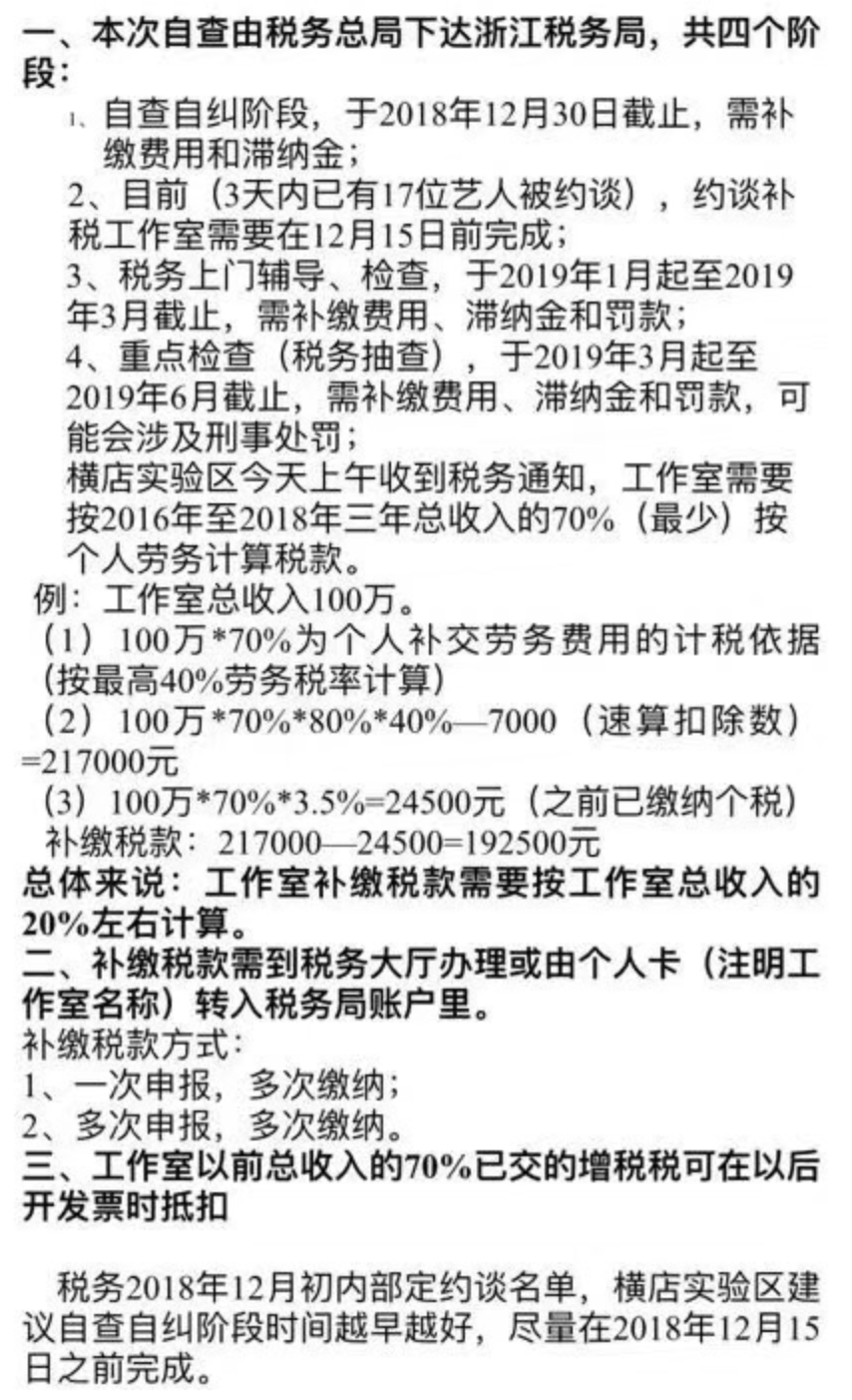 截图称已收到通知,演员、导演、编剧所有影视工作室将按2016年~2018年收入的70%补税,税率在30%左右。截图中还算了一笔账:若工作室总收入为100万元,按此规定则需最低补缴19万元。