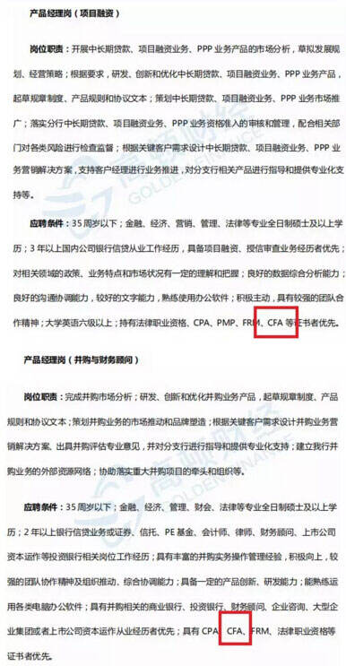 就比如,高顿君在仔细浏览了浦发银行的招聘需求后发现,其招聘的大多重要岗位,如果持有CFA、CPA、FRM、ACCA等证书,将是一大竞争优势。