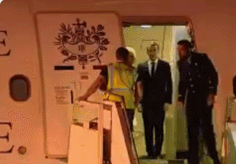 当舱门打开,和马克龙亲切握手的,居然是一个穿黄马甲的工作人员。