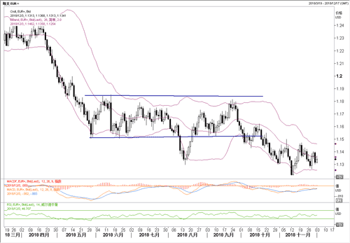 周五(11月30日),欧洲区公布一些数据均不良:11月份欧元区通胀由10月份的2.2%降至2%,同时食品和能源成本同比增长1.0%,这两个数据均低于初始预期;就业数据方面,上个月欧元区失业人口共计1320万人,比前月增加了1.2万人,失业率为8.1%,与9月份持平。之前公布的数据还显示,德国零售销售在10月份意外下滑。近期欧元区经济数据的下滑,恐将延后欧央行欲尽早进入加息的念头。以技术面分析,前景走势或有争议,价格日线仍在盘整的模式中,当前1.13的支撑力度显得关键,一旦跌穿恐将要测试1.1270甚至1.1214(11月12日的低点)。操作上可以考虑先行试着在1.1280附近设置多头欧元订单,触发后的止损订单宽摆于1.1210之下。
