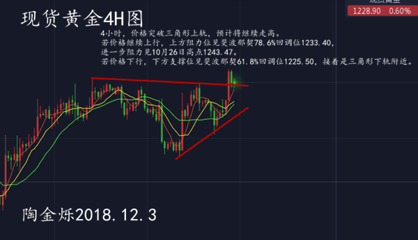 陶金烁:黄金突破三角形上轨,预计晚间将继续走高